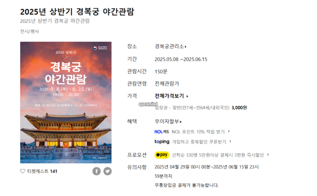 야간개장은 1일 최대 3,300명으로 입장이 제한됩니다. 이 중 3,000명은 사전 온라인 예매, 나머지 300명은 외국인 전용 현장 예매로 운영됩니다. 예매는 인터파크 티켓을 통해 가능합니다.